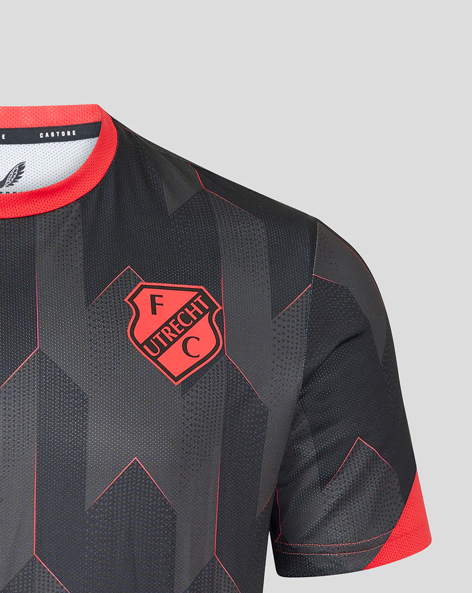 Bereid je voor op de wedstrijd in het FC Utrecht Matchday T-Shirt. Het ontwerp kenmerkt zich door een combinatie van strakke, hoekige vormen en scherpe lijnen, geïnspireerd op de architectuur van de Domtoren. De ronde hals en korte ingezette mouwen zorgen voor een onbeperkt comfort en maximale bewegingsvrijheid.